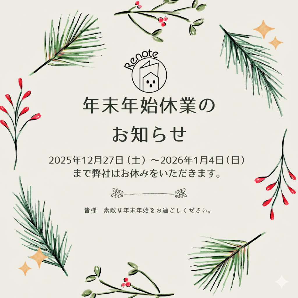 年末年始の営業について お知らせ / By renote0312 平素は格別のご高配を賜り、誠にありがとうございます。有限会社リノートでは誠に勝手ながら、年末年始休業日を下記のとおりとさせていただきます。 年末年始休業期間:2025年12月27日(土)~2026年1月4日(日) ご不便 … 年末年始の営業について もっと読む »